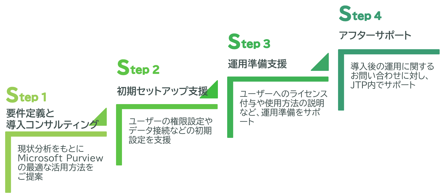 JTPの「Microsoft Purview導入支援サービス」は、4ステップでサポートを提供します。