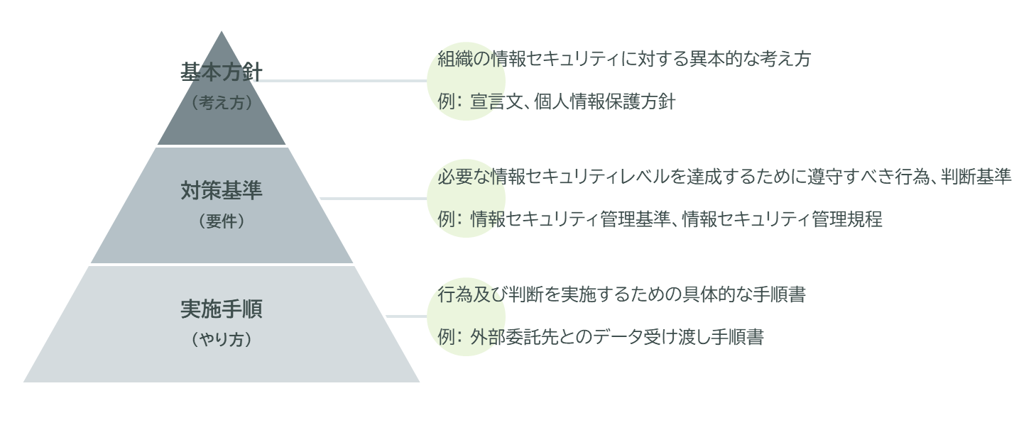 一般的に、情報セキュリティに関わる文書類は、運用・改定や参照のしやすさを重視し、3つのカテゴリーに分けて管理されます。