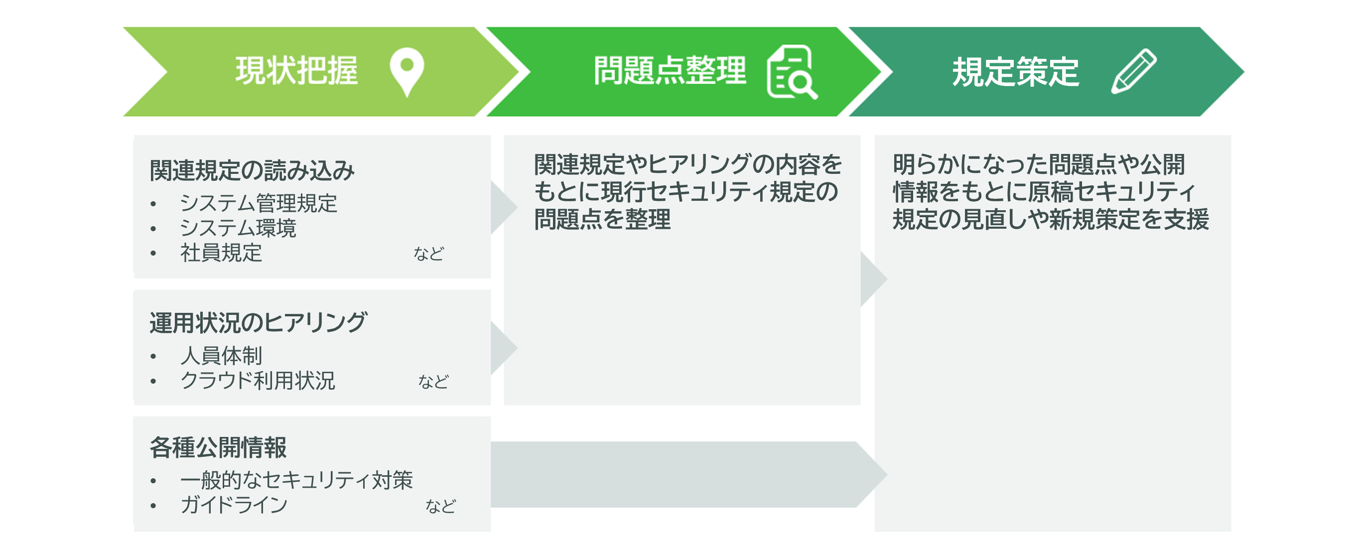 新たなセキュリティ規程の展開準備から、展開後の状況確認・改善活動のサイクルを継続的に支援します。